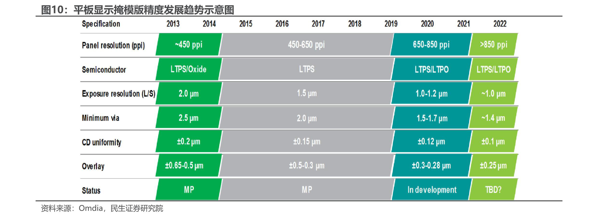 3)國(guó)產(chǎn)化進(jìn)程:半導(dǎo)體領(lǐng)域,國(guó)產(chǎn)廠(chǎng)商暫時(shí)集中在芯片封測(cè)用掩膜版以及100nm節(jié)點(diǎn)以上的晶圓制造用掩膜版,技術(shù)水平與國(guó)際領(lǐng)先的企業(yè)有較大差距:平板顯示領(lǐng)域,G11代線(xiàn)的掩膜版產(chǎn)品已有國(guó)產(chǎn)廠(chǎng)商突破壟斷,精度方面離國(guó)際最高水平還稍有差距。