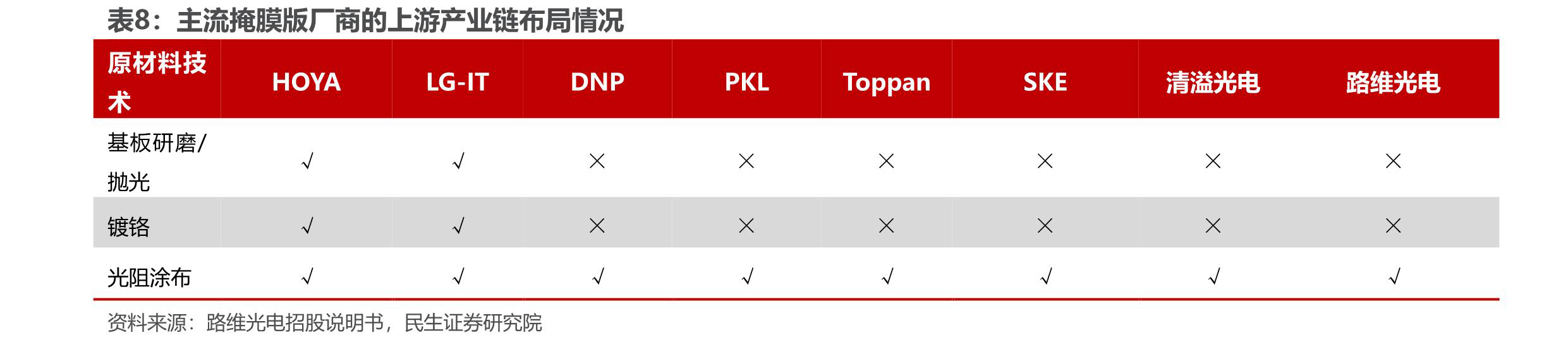 掩膜版廠(chǎng)商陸續(xù)向上游產(chǎn)業(yè)鏈延伸,以此降低原材料采購(gòu)成本和控制終端產(chǎn)品質(zhì)量。境外的廠(chǎng)商例如 HOYA、LG-IT 等企業(yè)已經(jīng)具備了基板研磨/拋光、鍍鉻及光阻涂布等掩膜版全產(chǎn)業(yè)鏈的生產(chǎn)能力。