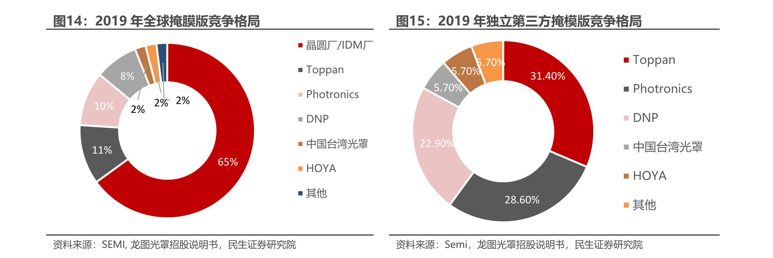 2)競(jìng)爭(zhēng)格局:據(jù)SEMI的數(shù)據(jù)統(tǒng)計(jì),2019年全球芯片掩膜版市場(chǎng)中,65%的市場(chǎng)份額由晶圓廠(chǎng)自行配套的掩膜版工廠(chǎng)占據(jù),剩余35%的份額則被獨(dú)立第三方掩膜工廠(chǎng)瓜分。