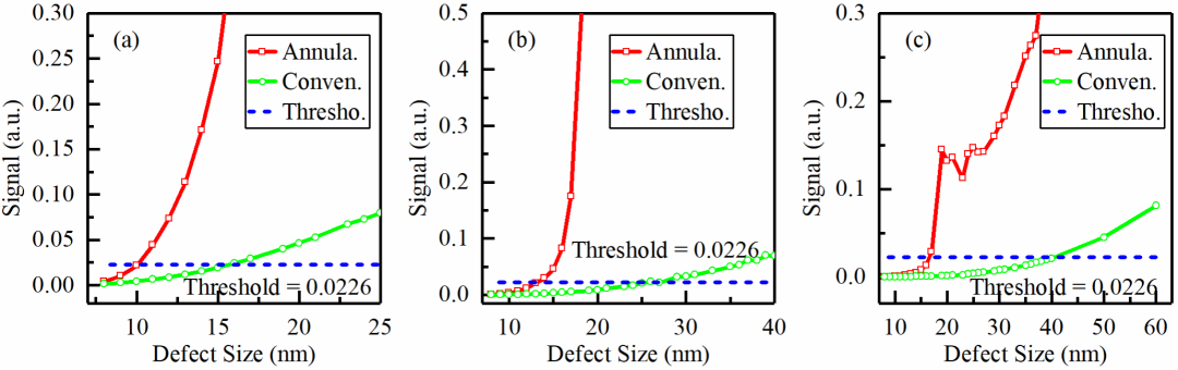 為了更便捷地研究晶圓缺陷的可檢測性,研究者們建立了缺陷檢測靈敏度這一概念,以定量評估檢測方法所具備的最小尺寸缺陷的檢測能力。目前,在晶圓缺陷檢測領域,缺陷散射信號的信噪比通常被用于反映缺陷檢測靈敏度,即缺陷散射信號強度與噪聲幅度的比值,其能夠可靠地揭示空間像和空間像差分中缺陷特征的顯著程度,以及可靠地反映缺陷檢測結果的置信水平。