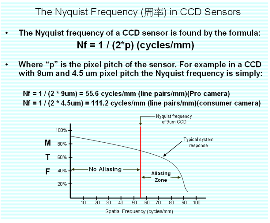 另一種方式就是將這片濾光鏡直接安裝在 CCD 的前面,使其曝光條件滿足空間頻率,影像中就不會出現(xiàn)摩爾紋。大量的數(shù)位相機與 DSLR 的 CCD 前安裝有低通道過濾器,Canon EOS 30D 甚至安裝了三組低通道濾片(因其CMOS 開口率較大故需要更佳的濾除效果)。透過這種方式,徹底過濾影像中高空間頻率部分,減少摩爾紋發(fā)生的機會,但這也會同步降低影像的銳利度。