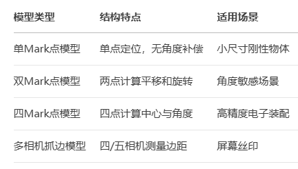 自對(duì)位模型通過(guò)機(jī)械定位確保目標(biāo)物體位置固定,僅需在對(duì)象端(待調(diào)整物體)設(shè)置相機(jī)進(jìn)行位置糾偏。其核心流程包括:示教模板位置→實(shí)時(shí)計(jì)算偏移量→機(jī)械糾偏→完成貼合。根據(jù)標(biāo)記點(diǎn)(Mark點(diǎn))數(shù)量與布局,主要分為以下類(lèi)型:
