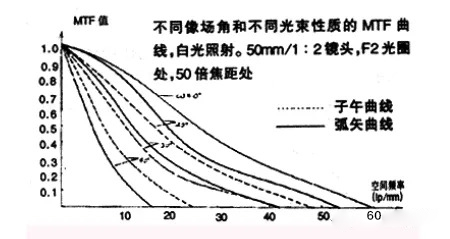 MTF表示的是調(diào)制傳遞函數(shù)的值隨空間頻率和像場位置變化的函數(shù)關(guān)系,它有很多種類型,最主要的兩種就是MTF值與空間頻率的關(guān)系以及MTF值和像場半徑的關(guān)系,空間頻率的單位是線對/毫米(lp/mm),隨著空間頻率的增加MTF值逐漸減小;像場半徑是像場上任意一點(diǎn)到像場中心的距離,在像場內(nèi)的分辨率標(biāo)板或光柵中的黑白線條,應(yīng)按兩個(gè)主要的方向放置,這兩個(gè)方向是檢驗(yàn)光學(xué)成像系統(tǒng)的法定方向,一個(gè)是平行于像場半徑的弧矢方向,也叫徑向,另一個(gè)是垂直于像場半徑的子午方向,也叫切向。一般弧矢方向的MTF值要高于子午方向,像場中心的MTF值最高,隨之像場半徑增大MTF值減小。