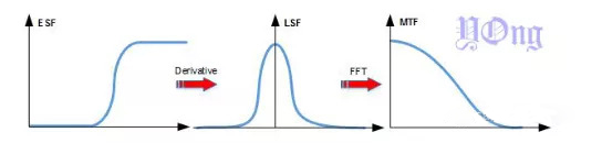 傾斜邊緣法的算法流程下圖,首先獲取傾斜邊緣的邊緣擴(kuò)散函數(shù)(ESF),然后求導(dǎo)得到對應(yīng)的線擴(kuò)散函數(shù)(LSF),最后傅里葉變換得到MTF。
