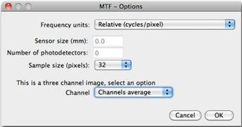 ImageJ 需要下載安裝 Slanted Edge Modulation Transfer Function 插件,需要注意的是只能測量豎直傾斜邊緣,從左至右由黑變白的矩形框,具體選項(xiàng)設(shè)置參考如下,sensor size單位是mm。