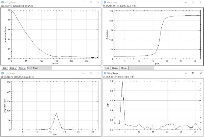 可以得到如下4張圖表,除了MTF外還有ESF、LSF、SPP,比較方便的一點(diǎn)是我們通過Data-Add將不同的MTF曲線添加至一張圖表中進(jìn)行對比分析。