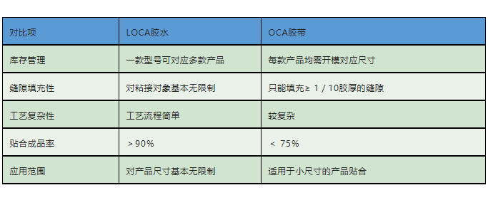 優(yōu)點(diǎn):可以粘接曲面或者不平整表面材料,對(duì)油墨厚度不敏感,易返工,成本較OCA低。