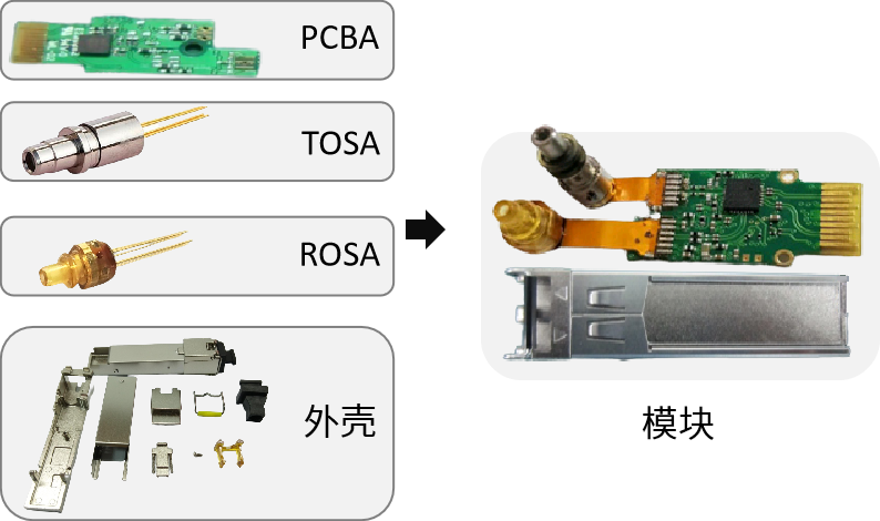光收發(fā)一體模塊由三大部分組成,它們分別是光電器件(TOSA/ROSA)、貼有電子元器件的電路板(PCBA)和LC、SC、MPO等光接口(外殼)。