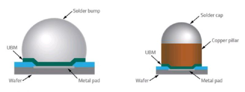 Bumping分為焊料和非焊料兩大類,按制作方法分為焊料凸塊、金凸塊、聚合物凸塊。凸塊工藝直接影響倒裝技術(shù)的可性能和性能可靠性。