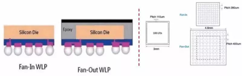 傳統(tǒng)的晶圓級封裝(Fan-in WLP),其I/O數(shù)受到芯片面積限制,適用于低引腳數(shù)的消費型集成電路封裝。隨著集成電路信號輸出引腳數(shù)目的增加,焊錫球的尺寸也變得越來越嚴格,PCB對集成電路封裝后尺寸以及信號輸出接腳位置的調(diào)整需求得不到滿足,因此衍生出了扇出型圓晶級封裝。