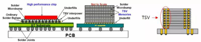 TSV是通過在芯片和芯片之間,晶圓和晶圓之間制造垂直通孔,通過Z方向通孔實現(xiàn)互聯(lián)。TSV實現(xiàn)了貫穿整個芯片厚度的電氣連接,更開辟了芯片上下表面之間的最短通路。與IC引線鍵合和使用Bumping技術(shù)不同,TSV能夠在三維方向使得堆疊密度最大,而外形尺寸最小,大大改善芯片速度和低功耗性能。但由于技術(shù)目前成本較高,主要應(yīng)用于圖像傳感器、粘結(jié)板、存儲器、邏輯處理器、MEMS晶圓級3D等高端封裝。