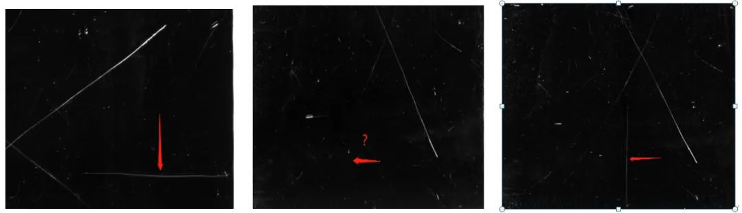 (a) 普通線光檢測(cè)“橫向劃痕” (b) 普通線光檢測(cè)“縱向劃痕” (c) 交叉線光檢測(cè)“縱向劃痕”