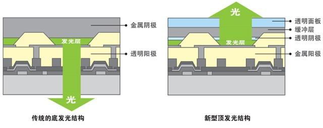 AMOLED也擁有底發(fā)光與頂發(fā)光兩種結(jié)構(gòu)。頂發(fā)光結(jié)構(gòu)中,光線不會(huì)受到驅(qū)動(dòng)電路的遮擋,相比底發(fā)光結(jié)構(gòu)擁有更高的開口率,從而在高解析度的應(yīng)用中具有更大的優(yōu)勢(shì),因此逐漸成為了AMOLED的主流。